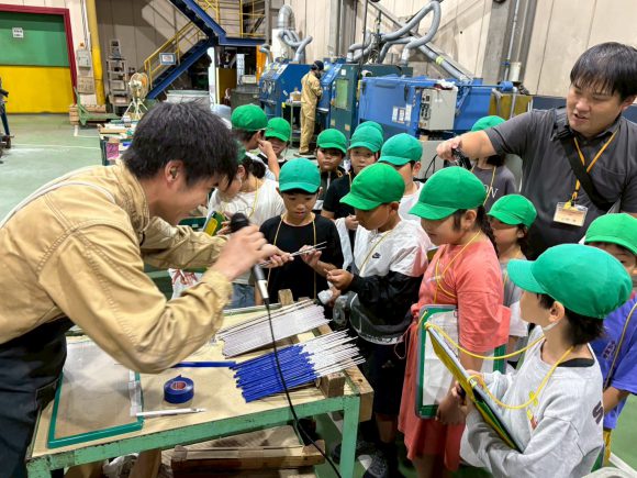 すっかり秋らしい陽気になりましたね!晴れてる日は気温もちょうどよく過ごしやすい。 本日は、10月14日に長田西小学校3年生が会社へ遊びに来てくれた時の報告をしたいと思います! 我が社では珍しい小学生の受け入れ。 今までは「危険だから…」と避けていた部分もあったのですが、 ファクハクや中学校の受け入れを行うようになってから 少しずつできる範囲を広げてきました。 これも現場の皆さんが快く受け入れてくれているおかげです。 本当にありがたい…。 内容は時間によっても異なりますが、 今回は工場見学とキーホルダー作り、そして質問コーナーを実施!工場見学ではファクハクで販売する溶射箸を発見! 職人さんに説明してもらい、子供たちも興味津々。
